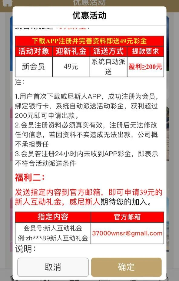 跟福彩那些台一样 看脸送的注册下载app送49 然后发邮箱送39 ,可以试试。 必须要同实名手机号+银行卡一致。
